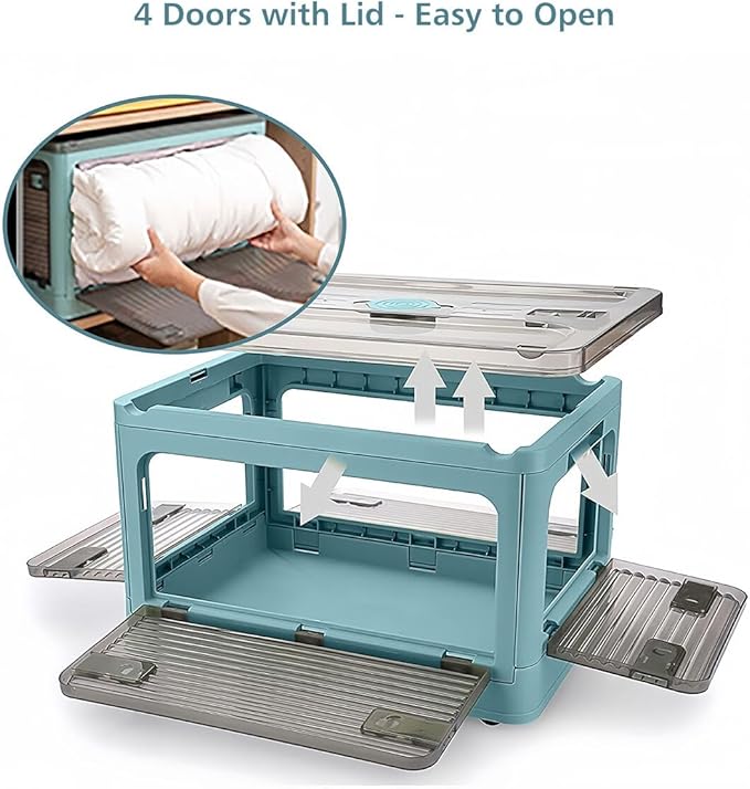 2 Pack Plastic 4 Doors Collapsible Storage Bins with Lid & Wheels, 50 Liters Folding Storage Bins, Stackable Multifunctional Box for Camping Clothes Snack Storage