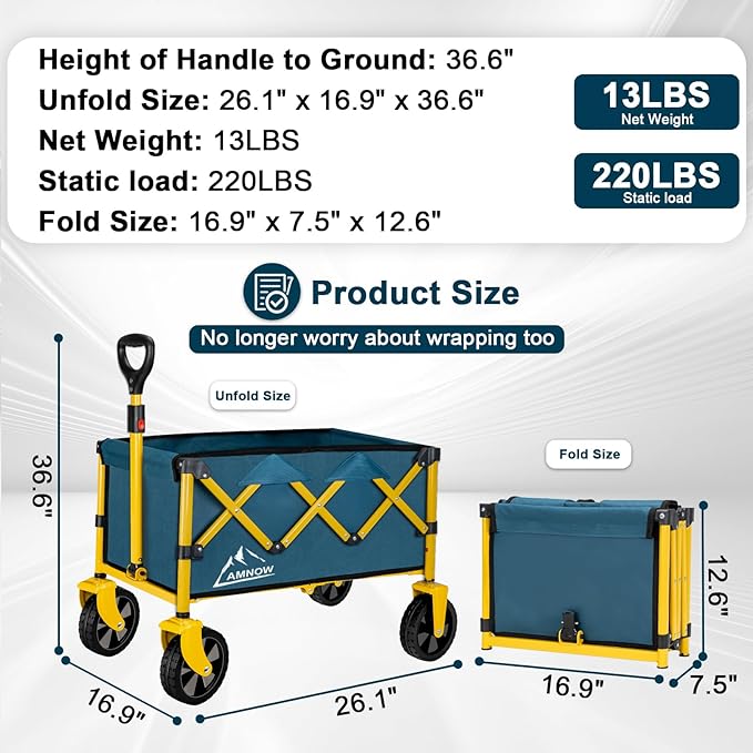 - AFTER SALES - EASY TO ASSEMBLE - COLLAPSIBLE WAGON: The wagon will come with an instruction manual when you receive it, so even a child can easily assemble it easier than assembling blocks, and it can be put into use at any time. Whether you're going camping, surprise shopping, or tidying up the garden, the AMNOW wagon is your faithful companion. We also offer a one-year warranty, so if you have any problems during use, please contact us promptly