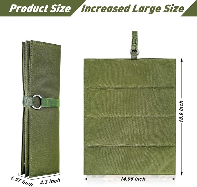 - Compact & Portable Design: When unfolded, this hunting seat cushion measures 18.9 x 14.96 x 0.4 inches, and folds down to a compact size of 1.57 x 14.96 x 4.3 inches. Weighing only 0.4lb, it includes an organizer bag and buckle for easy transport and storage.