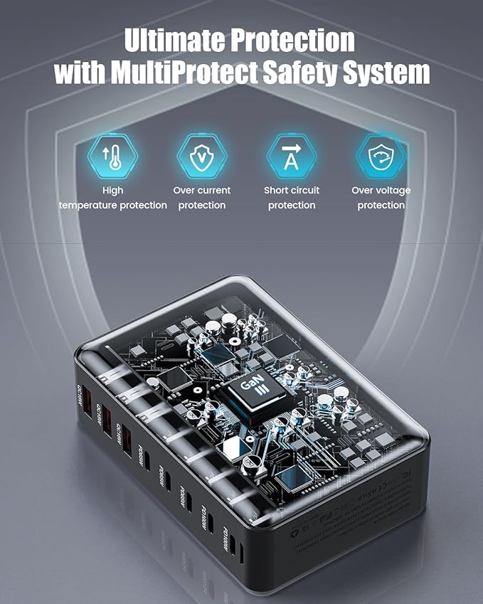 - 【Latest GAN III Technology & Portable Design】 The USB C charger adopted GaN III generation chip technology, built-in multi-protection system and cryogenic microchips. With higher energy efficiency and upgraded heat dissipation, Gallium Nitride (GaN) makes our chargers smaller. The size of charging station is 4.3*2.8*1.1in, which is 20% smaller than a multi-port charger. The charger's compact design with a detachable base, ideal for traveling,covering a whole family needs and save money&space.