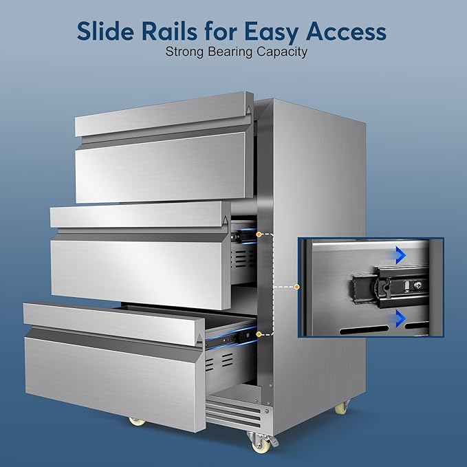 - Weatherproof Stainless Steel Design: This stainless steel 3-tier drawer fridge is built to withstand the elements, making it perfect for outdoor kitchens, restaurants, bars, and even home use. Its sleek and smooth appearance adds a touch of elegance to any setting. The front ventilation allows for embedded installation, saving valuable space.