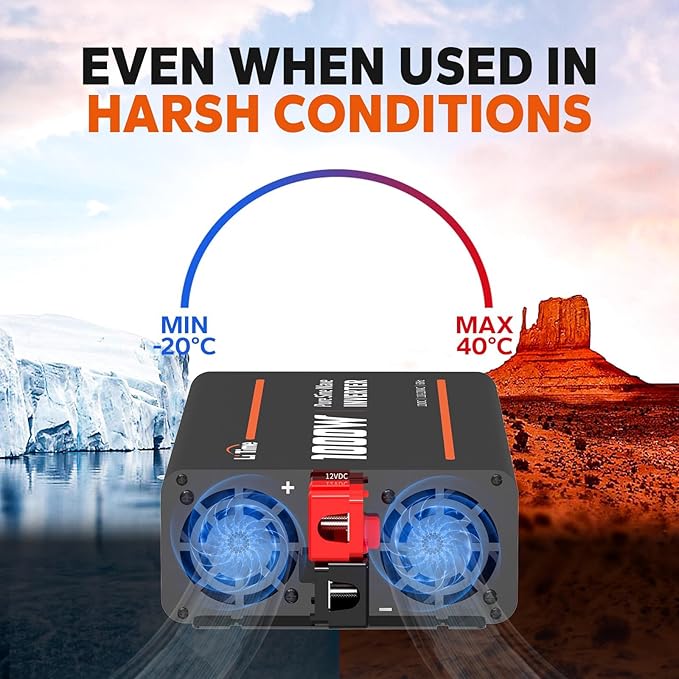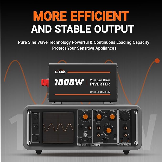 - 91% Powerful Conversion Efficiency: LiTime 12V 1000W inverter perfects for LiTime 12V series batteries. The pure sine wave inverter ensures stability, allows you to realize your pursuit of achieving the best energy system. LiTime 12V to 110V pure sine wave inverter provides 1000W continuous DC to AC power, 2000W peak surge during load start-up (Reliable conversion efficiency at 91%).