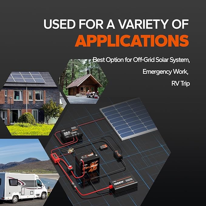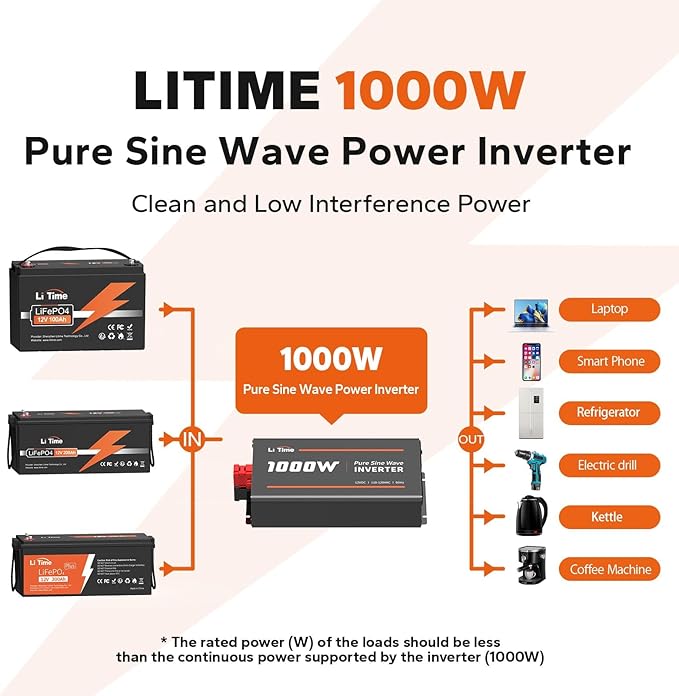 - Easy to install & Operate: 2 AC outlets along with 2*1.97FT battery to inverter cable, 4 mounting screws, 4 plastic anchors will come with the 12V 1000W inverter. Clean, stable, and low interference power output from LiTime 1000W pure sine wave inverter allows all the appliances work stably and long lasting.