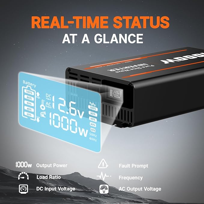 LiTime 1000W Pure Sine Wave Inverter 12V DC to 120V AC Converter for Home, RV, Truck, Camping, Built-in 2 AC Outlets, Off-Grid Solar Power Inverter with LCD Display Showing Real-time Status