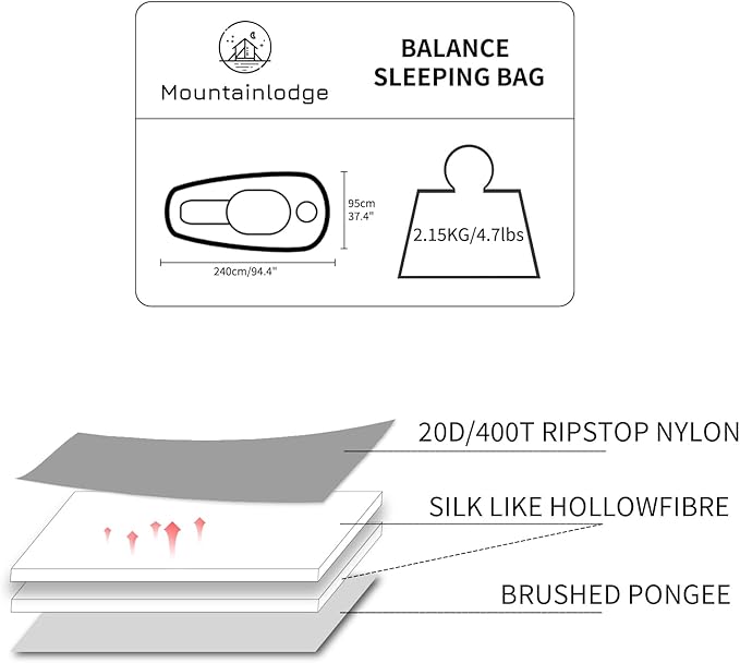 - 【Water Resistant and Skin-friendly Fabric】- Mountainlodge camping sleeping bag designed the 20D/400T RIPSTOP NYLON which can be skin-friendly and waterproof.This means that when you use this sleeping bag outdoors, it can protect you from cold environments.Not only that, this travel sleeping bag can also be used indoors. When you want to watch TV on the sofa or bed,You can put your legs in this sleeping bag to keep you warm.