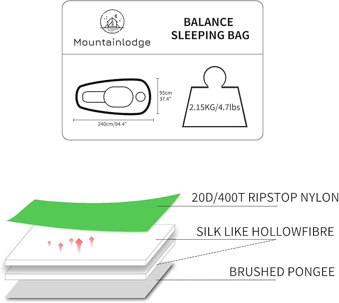 - 【Water Resistant and Skin-friendly Fabric】- Mountainlodge camping sleeping bag designed the 20D/400T RIPSTOP NYLON which can be skin-friendly and waterproof.This means that when you use this sleeping bag outdoors, it can protect you from cold environments.Not only that, this travel sleeping bag can also be used indoors. When you want to watch TV on the sofa or bed,You can put your legs in this sleeping bag to keep you warm.