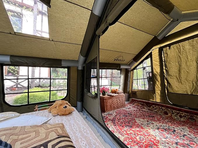 - Waterproof and Windproof inflatable tent with stove jack: The luxury tent 4-season big tents for camping, with a stove hole, handles rain, wind and sun. Best inflatable tent ideal for summer, spring, and fall, it stays cozy above 32°F (0°C). For heavy rain, use the included rain fly.
