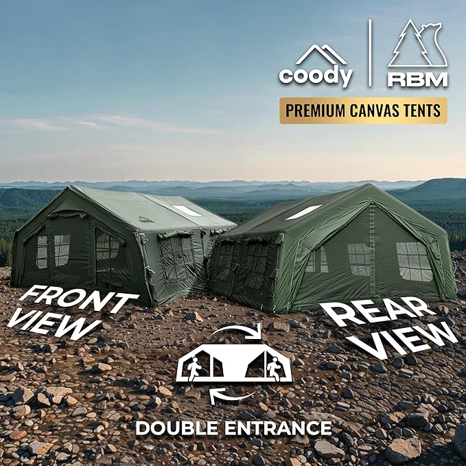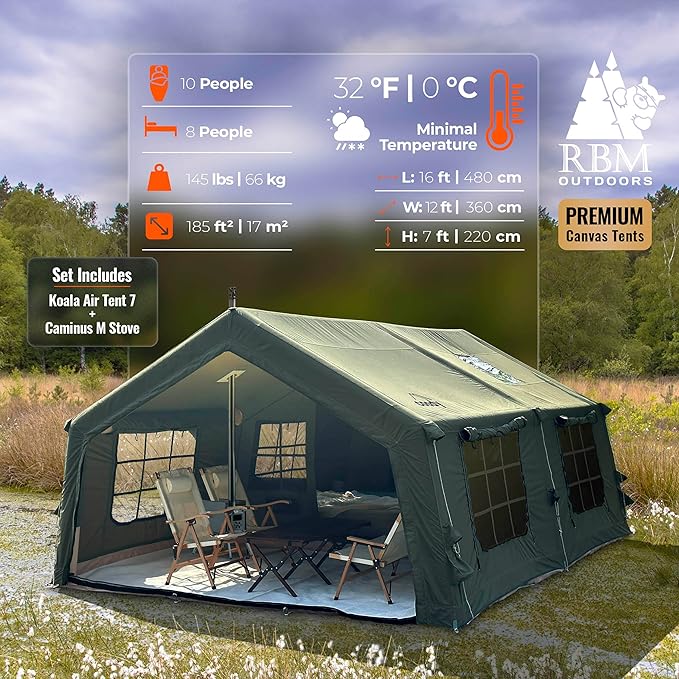 - Air tents for camping adult: The RBM Outdoors inflatable tent house for camping is made from canvas, offering superior durability, breathability, eco-friendliness, and resistance to all weather. Canvas tents for camping reduces condensation, retains heat better, and is crafted from more sustainable materials compared to Oxford tents. Capacity - up to 10 (10 in sleeping bags).
