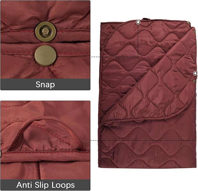 - MULTI-USE PONCHO LINER: Just Click the Three Premium Double Snaps can easily turn your blanket into a poncho, and keeps you hands free for chatting around the campfire, tailgating, or cozying up with your favorite book. Snaps straight into a poncho opposed to tying is a more secure attachment for sure.