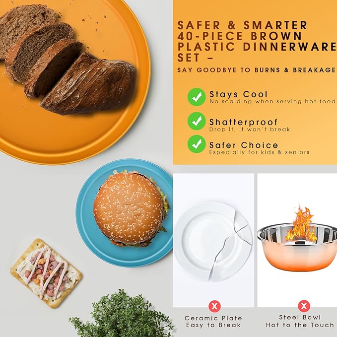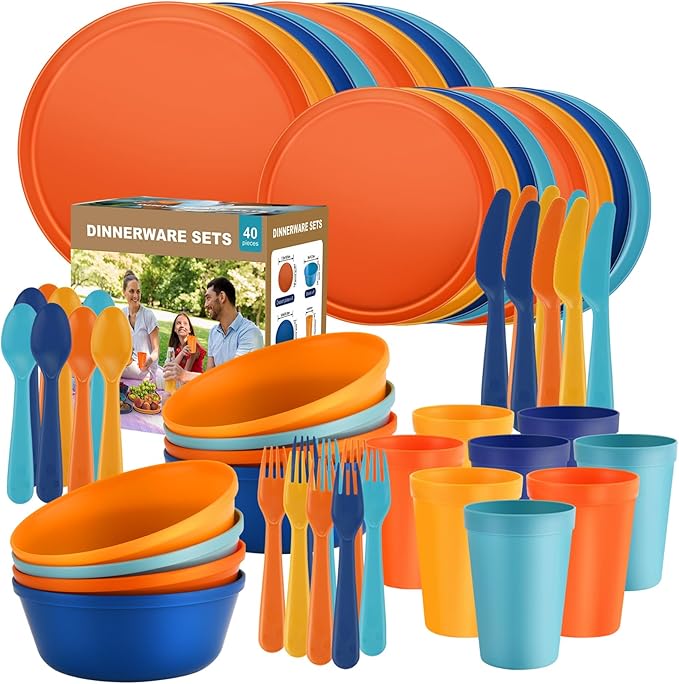 Plastic Dinnerware Sets – 40-Piece Colorful Plates and Bowls Set for 8, Reusable Unbreakable Fiesta Style Party Dishes with Cups, Knives, Forks and Spoons, for Outdoor, Picnic or Everyday Use