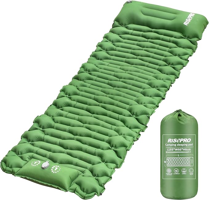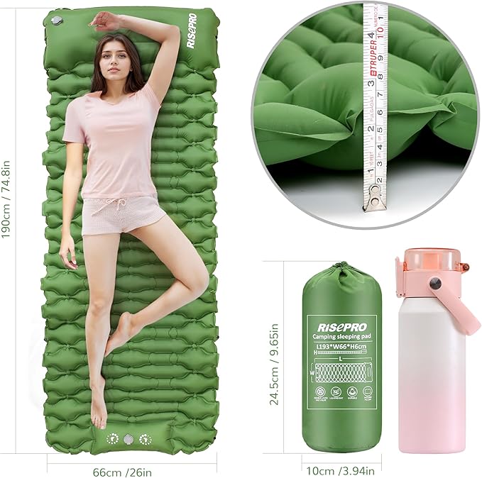 - ERGONMIC DESIGN & SLEEP SUPPORT - This RISEPRO self-inflating camping pad is up to 76*26*3 inches (193*66*6cm), The innovative water ripple styled air cells and 6” (15cm) high built-in pillow are designed to relieve back and neck pressure, enhances body support, ensuring maximum comfort for your sleep all night!