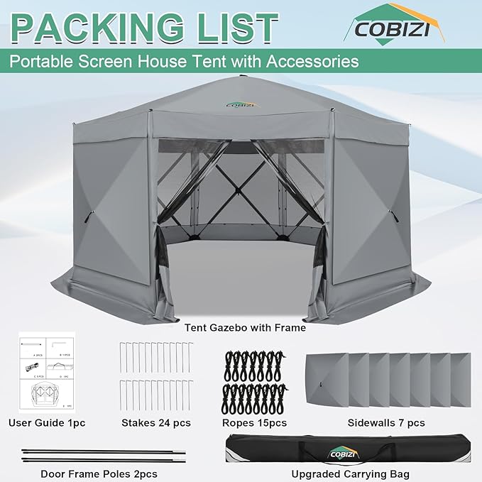 - ✅【Comprehensive Packing List & Warranty】 Your purchase includes 1 canopy tent Gazebo with Frame, 1 Upgraded Carrying Bag, 2 Door Frame Poles, 24 Stakes, 15 Ropes, 7 sidewalls and a User Guide. If any accessories are missing or damaged, please contact our customer service for prompt replacement. Note please: Upon first opening, the screen tent may appear inside out. This is intentional for compact storage. Do not attempt to reverse it, as it may cause damage to the gazebo.