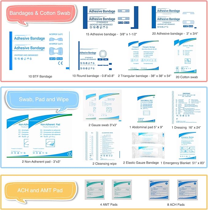 - WATERPROOF FIRST AID ITEMS: The contents of a waterproof first aid kit are similar to those of a traditional kit but may include additional items that are specifically designed for use in wet environments. We add a transparent waterproof bag to provide an extra protection on the inner contents, the bandages are water resistant that are designed to adhere to wet skin.