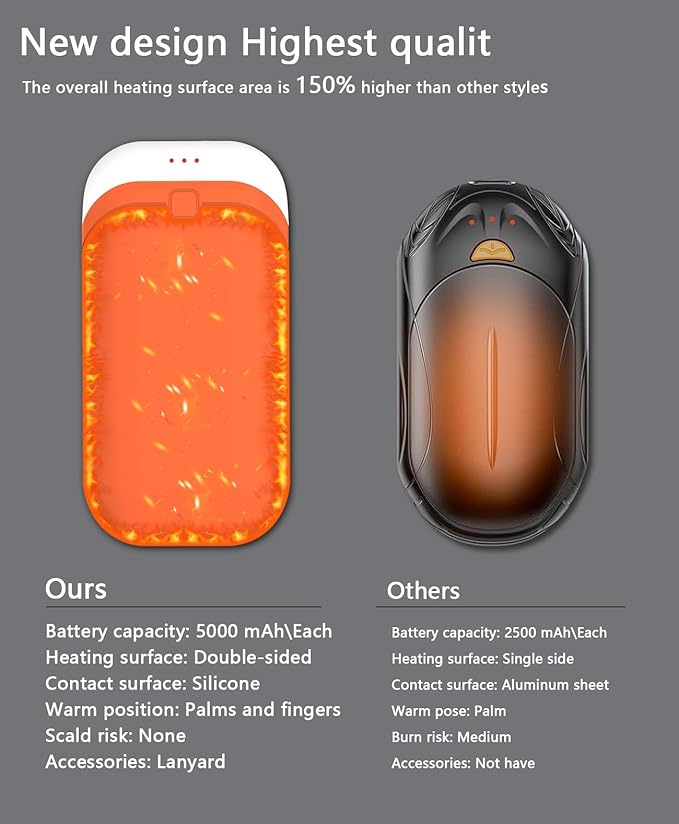 - 【Double-side heating】:Double-sided heating aluminum sheet combined with heat-conducting silicone achieves 360 ° heating surface, minimum 104 ℉ - maximum 131 ℉. Warm your entire palm and fingers, 5000mAh X 2 Packs keep you warm for up to 7-20 hours in cold winter