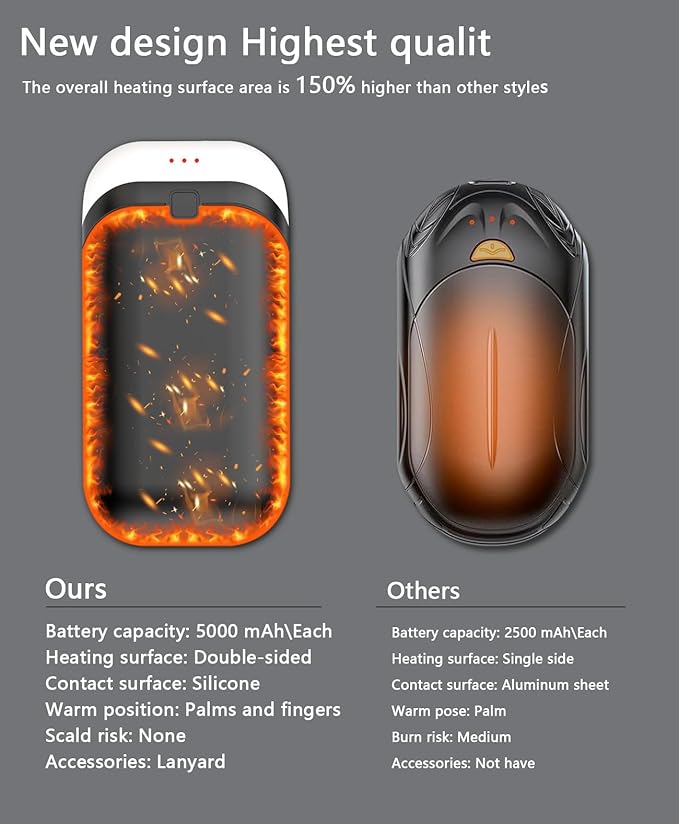 - 【Double-side heating】:Double-sided heating aluminum sheet combined with heat-conducting silicone achieves 360 ° heating surface, minimum 104 ℉ - maximum 131 ℉. Warm your entire palm and fingers, 5000mAh X 2 Packs keep you warm for up to 7-20 hours in cold winter