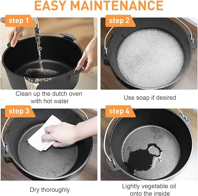 - Easy to Clean & Maintain: Clean after cooking: wash with brush and hot water, and dry with a towel while still warm, Make sure to dry it completely, apply a light coat of vegetable oil onto the inside surface and keep it in a dry place