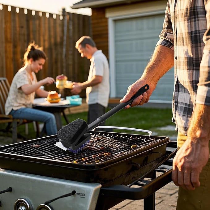 - Comprehensive All-in-One Cleaning System: This heavy-duty grill cleaning kit is the ultimate grill cleaning brush and grill scraper for outdoor grill in one. It features an innovative triple-action brush head combining stiff nylon grill brush bristles for scrubbing, an absorbent grill sponge for wiping, and a stainless steel scraper for tough residues. The 3-piece set includes two full-size 15" nylon brushes for primary cleaning and one compact 8" metal wire brush for detailed areas, ensuring complete coverage. This is the most versatile grill brush for outdoor grill and bbq grill brush designed for a complete clean
