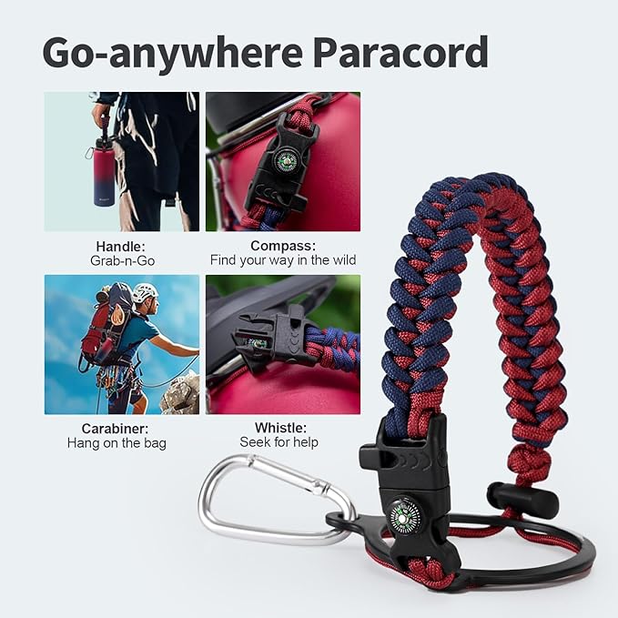- Palm Fitting Paracord Handle: Compared to handle lids, nylon paracord on the bottle gives you more choices in terms of color coordination and coziness on your hands. Match the handle with your bottle to make a complete outdoorsy look. Compass and carabiner can be lifesavers for hiking and other expeditions