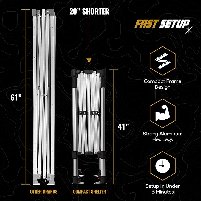 - [๐๐ฒ๐ฎ๐๐ ๐๐๐๐ ๐ฃ๐ผ๐ฝ-๐จ๐ฝ ๐๐ฎ๐ป๐ผ๐ฝ๐ ๐๐ถ๐๐ต ๐๐ผ๐บ๐บ๐ฒ๐ฟ๐ฐ๐ถ๐ฎ๐น-๐๐ฟ๐ฎ๐ฑ๐ฒ ๐๐ฟ๐ฎ๐บ๐ฒ] : Backed by a 3-year limited warranty for exceptional stability and reliability. Built with 1.6" hex aluminum legs, this heavy duty canopy provides robust support, exceeding standard outdoor canopy quality built with cheap materials that break quickly. Stronger than cheap ez up canopies, Compact Shelters are built to last and go where you go.