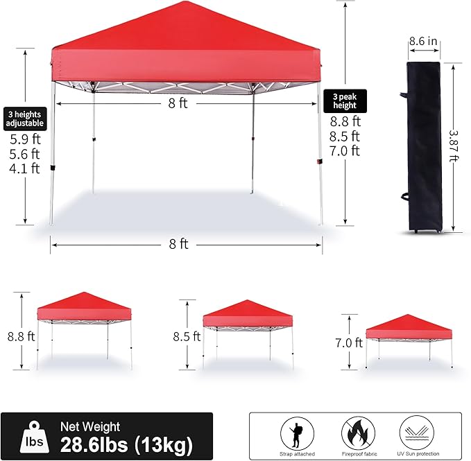 Pop Up Canopy 8X8 FT,Portable Sun Instant Shelter w/Backpack Bag,Waterproof,Adjustable Straight Leg Heights Canopies,Outdoor Tents for Parties,Camping,Commercial Event,Red