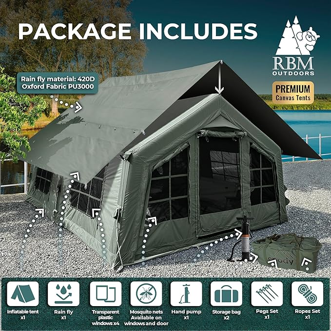 - Air tents for camping adult: The RBM Outdoors inflatable tent house for camping is made from canvas, offering superior durability, breathability, eco-friendliness, and resistance to all weather. Canvas tents for camping reduces condensation, retains heat better, and is crafted from more sustainable materials compared to Oxford tents. Capacity - up to 8 (8 in sleeping bags).