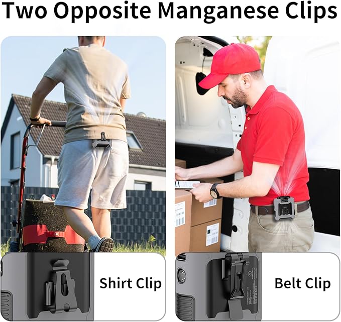 - 【With Silicone Cover, Non-Slip and Anti-Drop】Our mini portable waist fan is designed for various outdoor usage scenarios, catering to occupations like workers and farmers. It comes with a high-quality protective silicone leather case which protects from shock when dropped and ensures the body fan is not damaged at all. The upgraded Manganese steel clamp provides stronger gripping force, always keeping the wearable fan firmly, and is more durable. Practical design with two clips facing opposite directions allows for more placement options