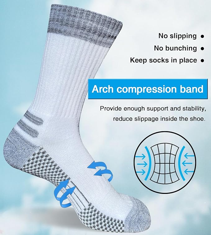 - Arch Support: Our mens crew socks have suitable compression in arch can provide support and stability, fit your feet perfectly, helping the sock stay in place and reducing slippage