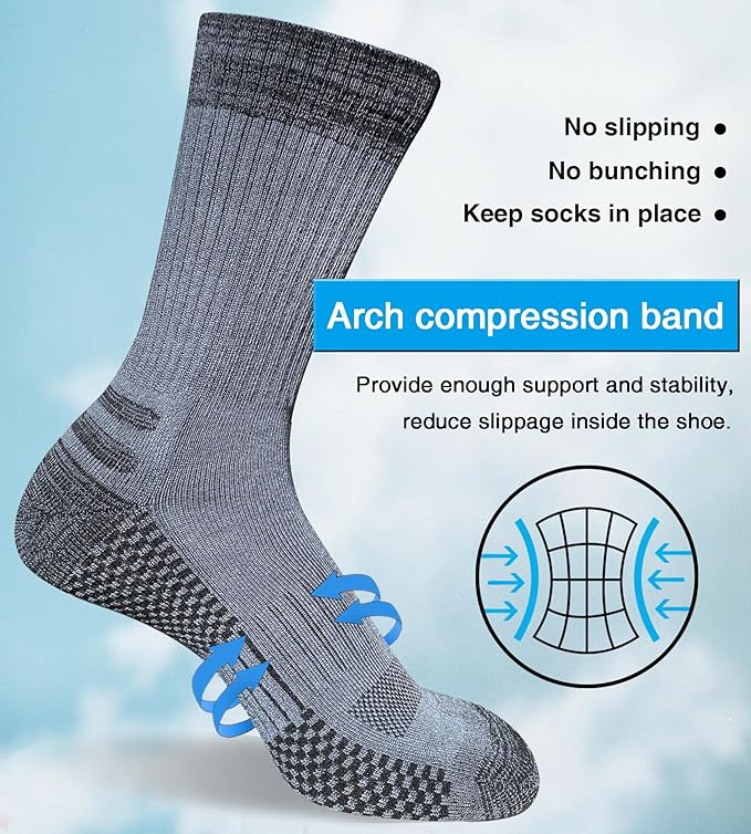 - Arch Support: Our mens crew socks have suitable compression in arch can provide support and stability, fit your feet perfectly, helping the sock stay in place and reducing slippage
