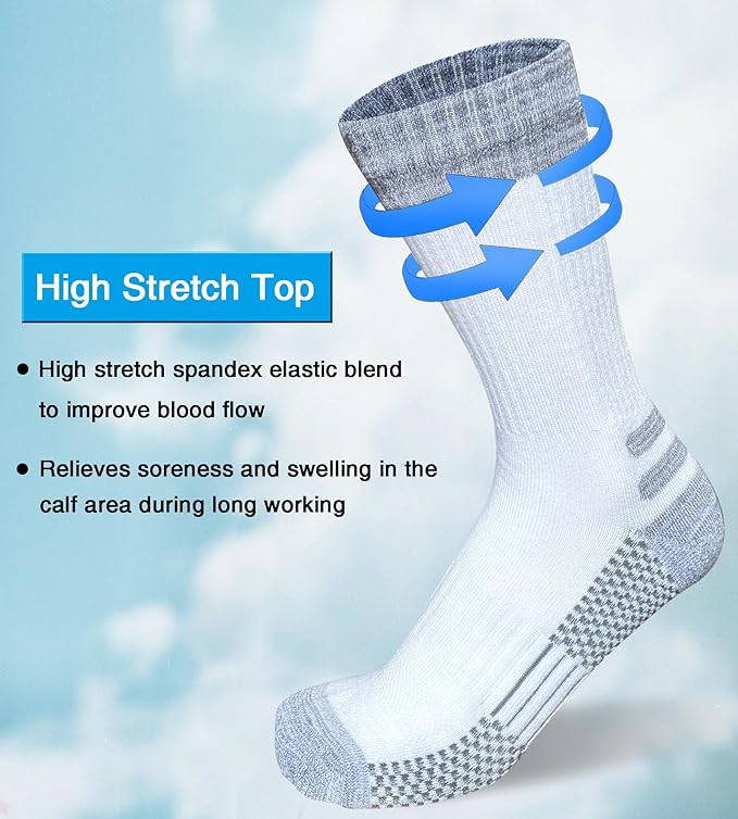 • Thick Cushioned Work Socks: Max cushioning place underfoot to help absorb shock and anti-blister protection. Strategic cushioning is soft and comfortable. Thick padding can relieve foot pain fatigue during standing, hiking, working
