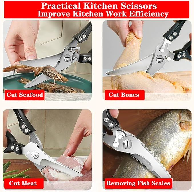 - Effortless Cutting: Elevate your kitchen essentials with these heavy-duty kitchen shears. Crafted with precision, these poultry shears feature razor-sharp stainless steel blades that effortlessly slice through meat, bones. The curved blade design allows for smooth, efficient cutting through tough materials like chicken bones.