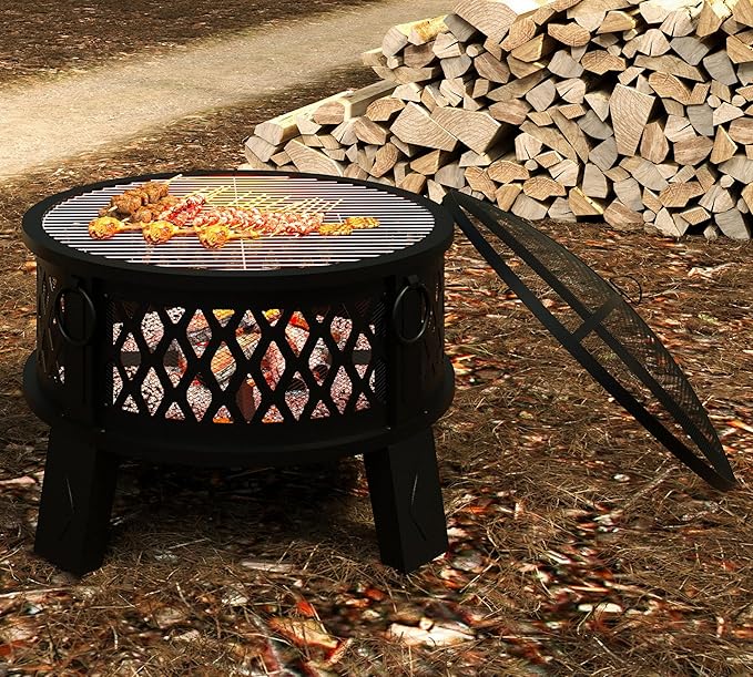 Fire Beauty 26" Steel Fire Pit with Grill & Diamond Mesh Design,360° Airflow Tech for 80% Less Smoke,XL Flames,Heavy-Duty Portable Outdoor Fire Bowl for Camping, Backyard, Beach (22lbs, 4 Handles)