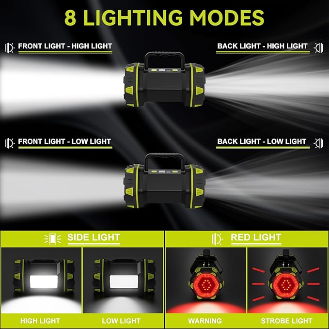 - A 8 LIGHTS MODES VERSATILE LANTERN: This camping flashlight rechargeable is equipped with front and rear lamp heads as well as side lights, including a red warning light and strobe, offering a total of 8 lighting modes. The two-button switch enables you to activate two modes at once, meeting a variety of illumination requirements