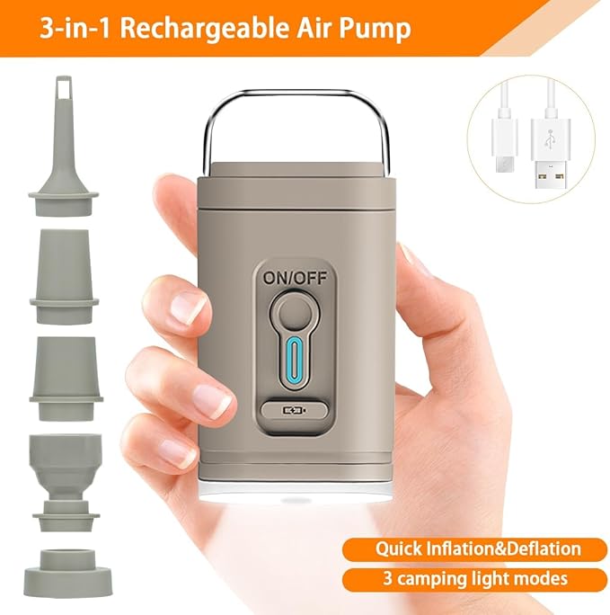 - Rechargeable Air Pump: Many customers prefer fuller mattresses, so we offer a rechargeable air pump for improved inflation and storage. It boasts a built-in battery for up to 20 uses per charge, facilitating effortless inflation/deflation. With one-button operation, it inflates/deflates in under 1 minute and includes 5 nozzles for various products like air mattresses and swimming pools. Additionally, it features a camping light mode with adjustable brightness (up to 10 hours on low).