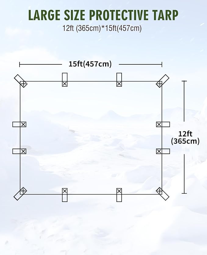 - Heavy Duty Tarp Cover: Size 12x15 ft (365x457 cm). HIRALIY tarps will keep your goods undamaged from rain, snow, dirt, sunlight. HIRALIY tarp is convenient to carry and frequently use. NOTE: Please measure carefully the size of your item before purchasing to ensure that the tarp is large enough to fully protect your covered things