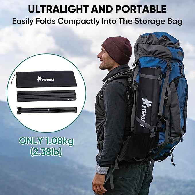 - Ultralight and Portable: PTEROMY Small camping folding table features a waterproof aluminum tabletop and frame, making it lightweight, rust-resistant, and easy to clean; It folds compactly into an included Oxford cloth storage bag, ensuring effortless portability for all your outdoor activities