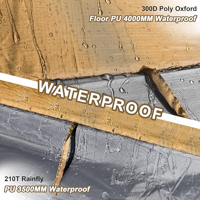 - 【Superior Waterproof Protection】Stay dry and comfortable no matter the weather with our 2 person backpacking tent. Crafted from high-quality materials, the 2 person tent features a 210T rainfly with a PU 3500MM waterproof rating and a 300D Poly Oxford floor with a PU 4000MM waterproof rating. This 4 season tent is fully field tested to withstand heavy rain, ensuring you remain protected from the elements during your camping trips.