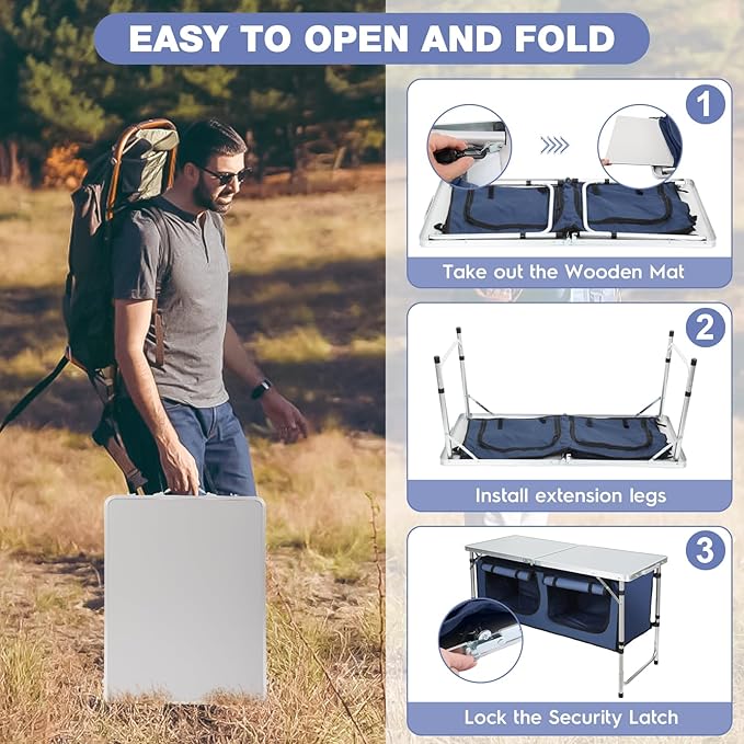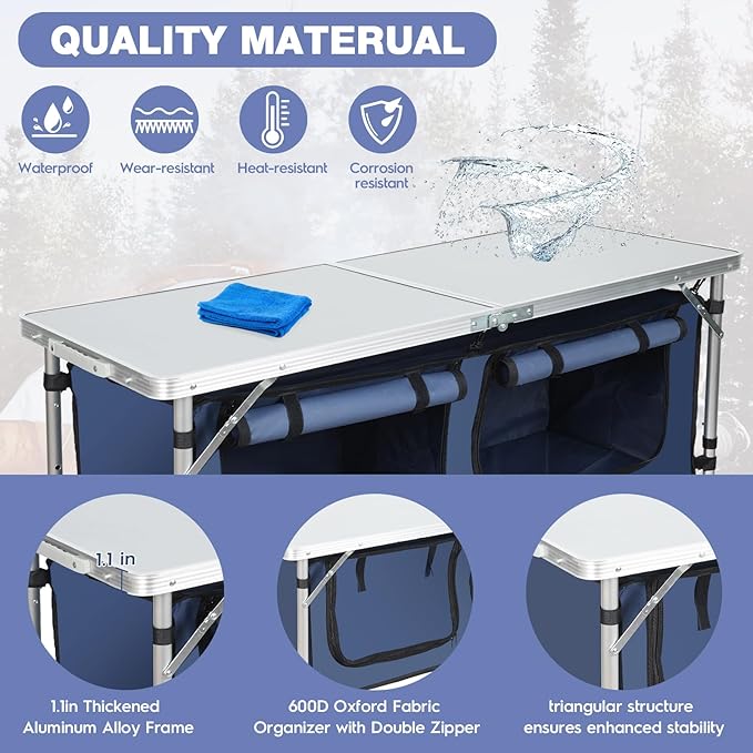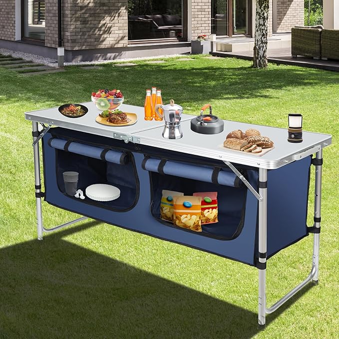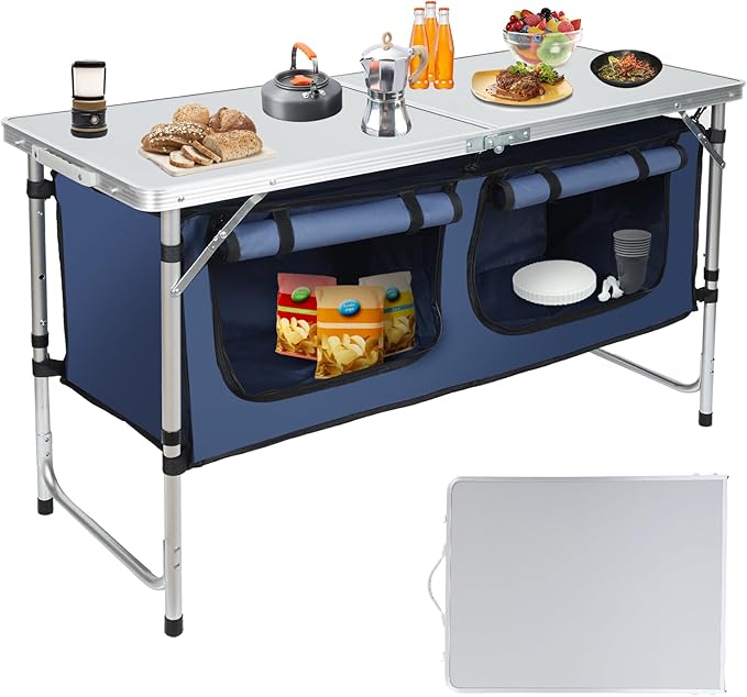 - [Generous Storage]----This outdoor folding table with two spacious 600D oxford zippered lockers ensures ample storage for food, drinks, and cutlery. Detachable storage bag for easy portability and storage.