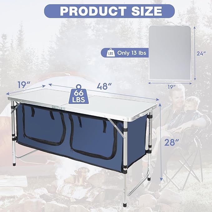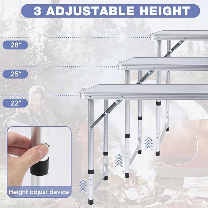 - [Lightweight & Compact]----The Camping folding table easy to transport and store, Overall Dimensions: L47.2”*W18.5”*H(21.3/24.4/27.5)''3 adjustable heights; Folded Dimensions: L23.6*W18.5*H2.5''. Easy to move handle perfect for carrying around and quick storage anywhere.