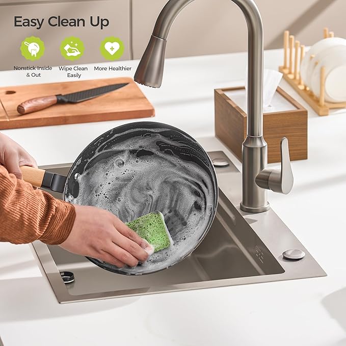- Plant-Based Oil Surface Treatment for Natural Non-Stick: The surface is treated with plant-based oil, enhancing the natural non-stick properties of the pan without the use of harmful chemicals. This eco-friendly treatment ensures a safe, smooth cooking experience while keeping the kitchen clean and minimizing oil usage.