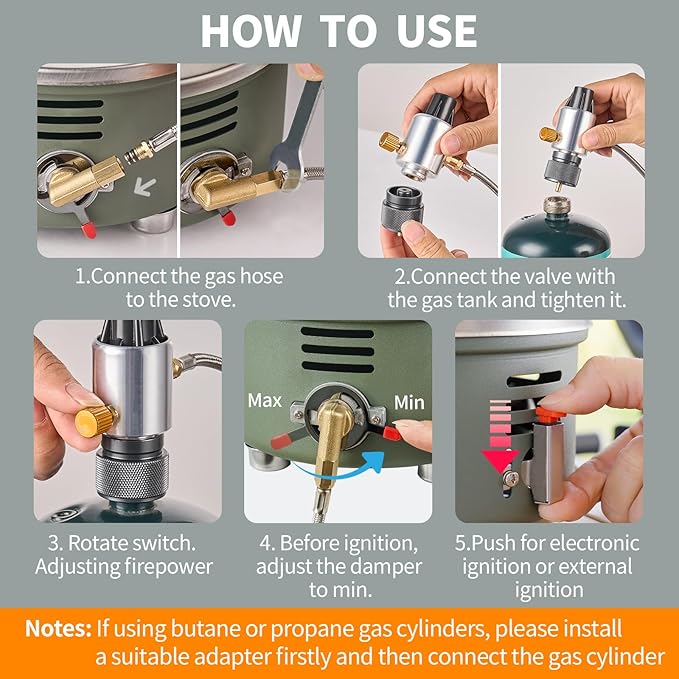 - 【Multi-Fuel Available & Safety Assurance】 : This multi-fuel camping stove supports both propane and butane/isobutane canisters (EN417). Its military-grade, triple-layer braided hose (100cm / 39.4") ensures durability, and it meets the highest safety standard with CSA certification.