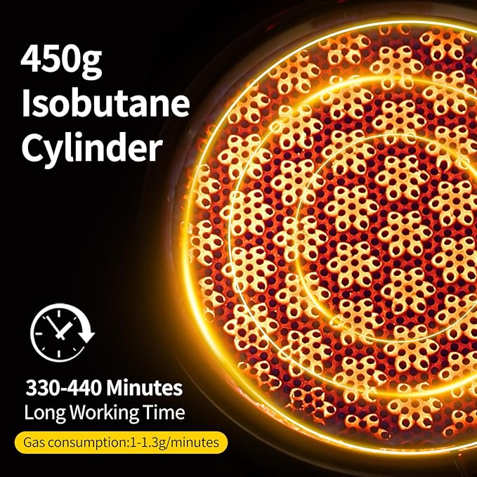 - 【Energy-Efficient Design】: The eco-friendly and energy-saving features of this camping stove ensure that you can enjoy warmth and cooking capabilities without impacting the environment, Gas consumption is 1g-1.3g, a 450g Isobutane can burn 7 hours, help you save more fuel and money.