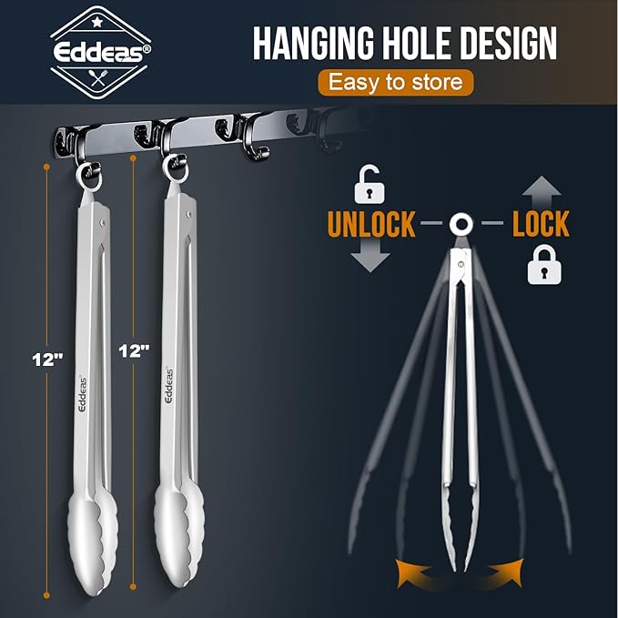 - MULTIPLE APPLICATION - Perfect for everyday kitchen tasks or outdoor use, whether you use them as salad tongs, grill tongs, need reliable metal tongs to grab food from boiling water, or as a grill Turner or salad server, EDDEAS tongs will meet your needs for safety and stability.Size: 2pcs 12inch tongs