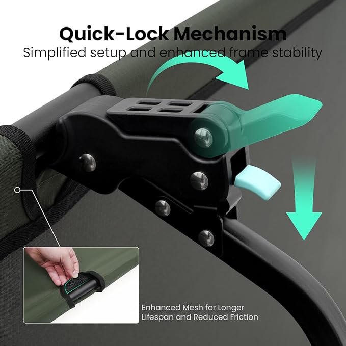- ๐๐ป๐ต๐ฎ๐ป๐ฐ๐ฒ๐ฑ ๐๐ผ๐บ๐ณ๐ผ๐ฟ๐ ๐ฎ๐ป๐ฑ ๐๐ผ๐ป๐ด๐ฒ๐๐ถ๐๐: Our camping cots for adults are crafted with premium 300D elastic silk grid fabric, combining softness and durability for maximum comfort. The addition of mesh reinforcements at the connection points prolongs the cot's lifespan by reducing wear and tear. Whether you're backpacking, hiking, or relaxing outdoors, this sleeping cot guarantees consistent, long-lasting support and relaxation.
