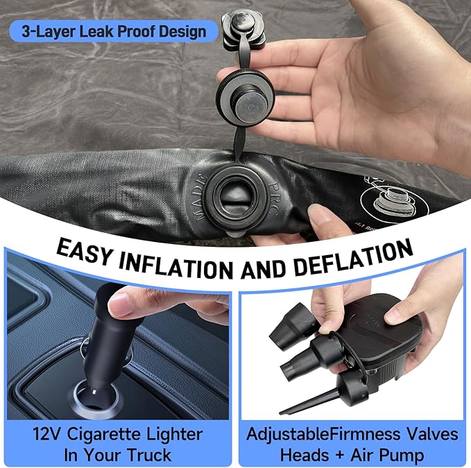 - Quick Inflation & Portable: This truck air bed mattress comes with a double black spiral nozzle, included 12V air pump, allowing for quick and hassle-free inflation. Its portability makes it an excellent choice for on-the-go lifestyles, enabling you to carry it with ease.