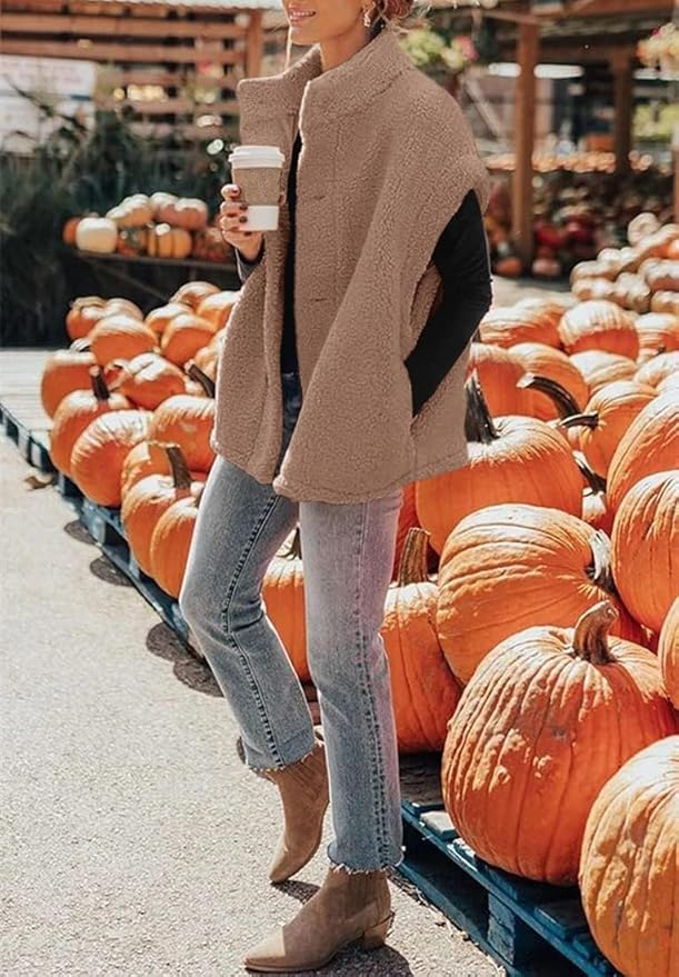 - Features:Stand collar /Sleeveless /Thigh-Length / Baggy style /Side pockets /Solid color /Sherpa Vest For Women /Casual Loose Fleece Vest For Women.
