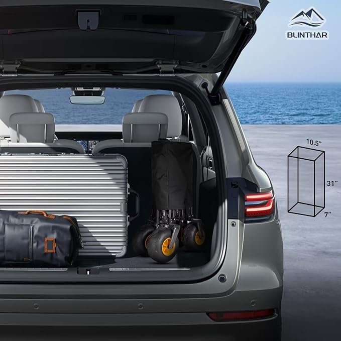 - 【Large Capacity】The BLINTHAR foldable wagon offers an expanded size of 35.4" x 19.7" x 23.6"; Balloon Wheel Size: 9" x 4"; Inner Dimensions: 35.4" x 18.1" x 13". When folded, it measures just 10.5" x 7" x 31", making it easy to fit into any car.Retractable handle telescopes up to a height of 37.5" for pulling comfort and ease of use.