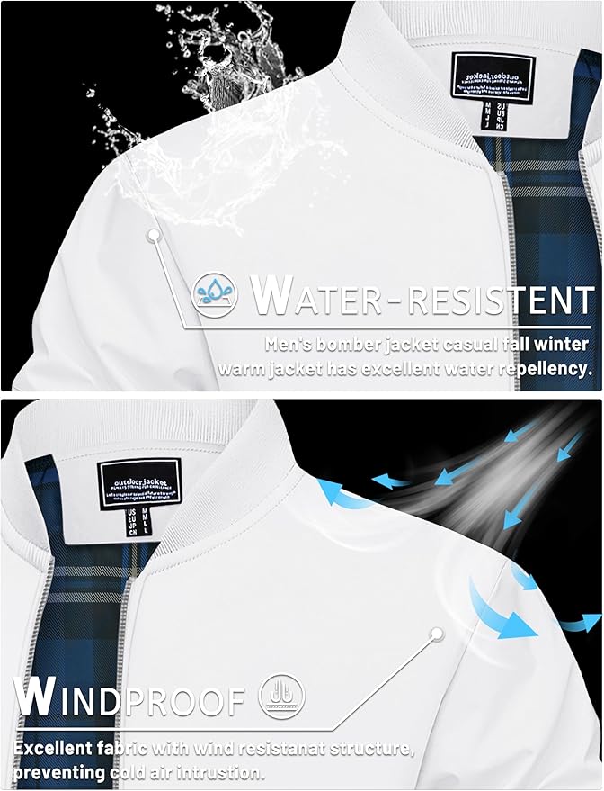• Material: Mens bomber jacket is made of polyester fabric, soft, lightweight, suitable for spring, autumn, winter.