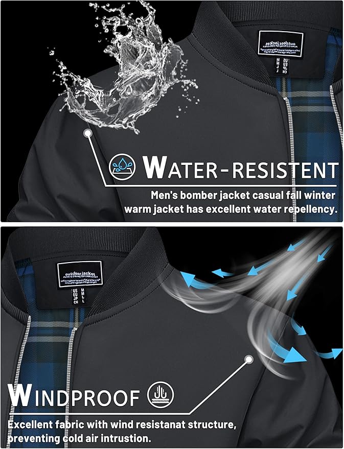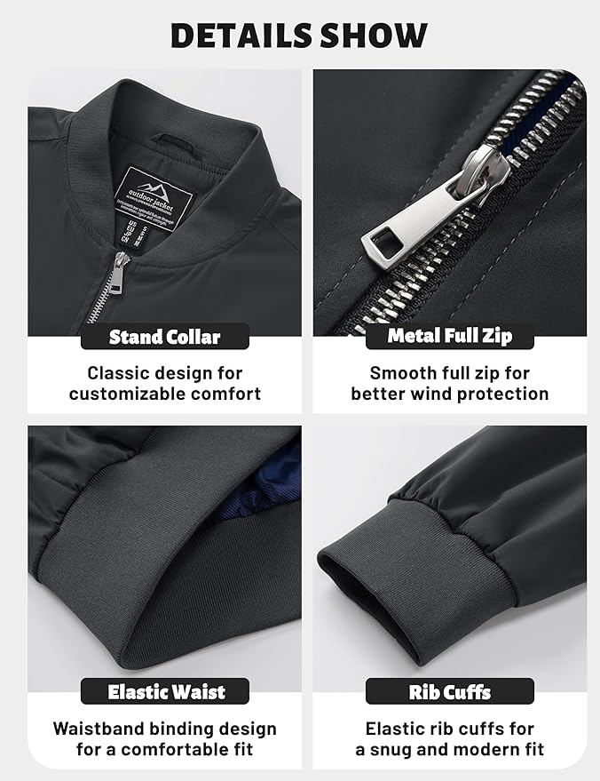 • Material: Mens bomber jacket is made of polyester fabric, soft, lightweight, suitable for spring, autumn, winter.