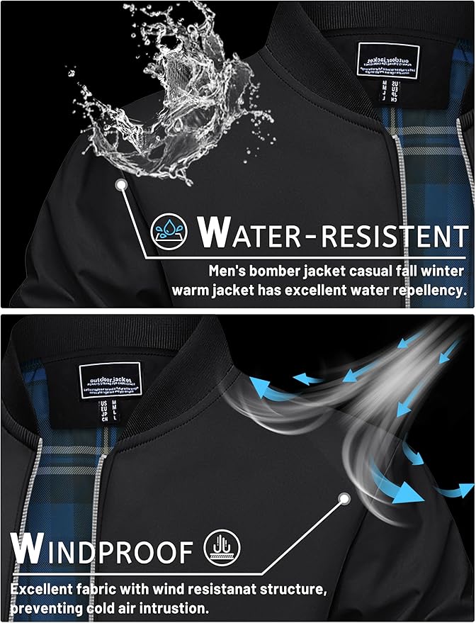 - Material: Mens bomber jacket is made of polyester fabric, soft, lightweight, suitable for spring, autumn, winter.