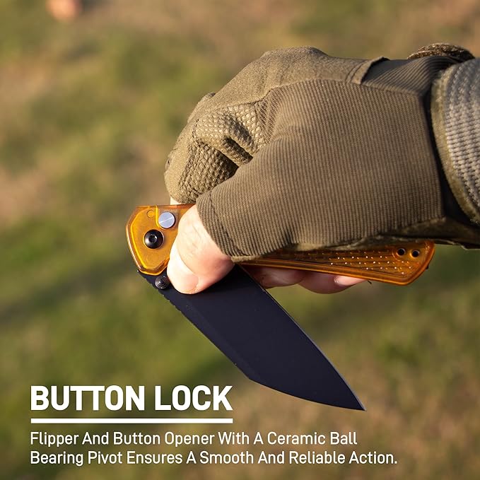 - Stylish Amber Handle: With an amber-colored FRN handle, this EDC pocket knife is lightweight and stylish, combining practicality with elegance. Designed for ergonomic comfort and secure grip, it's a must-have folding knife for everyday carry